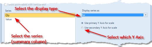 For certain chart types, you can also select whether to display a series as a line, bar or area, and if the object type has a dual Y axis, which Y axis to display the series on.