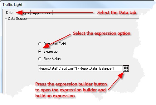 If you want your traffic light to represent the value of an expression, select the Data tab in the traffic light dialog box, select the Expression option, and press the expression builder button to open the expression builder and build your expression. |