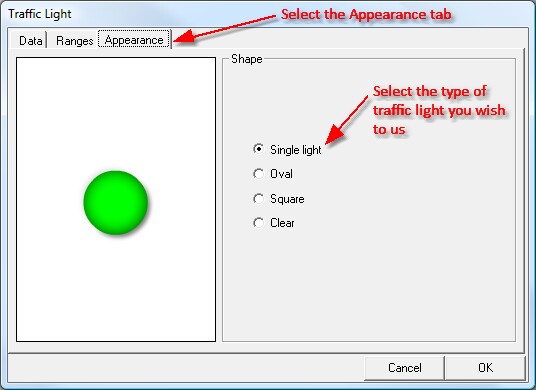 To select the type of traffic light you would like to add to the report, select the Appearance tab, then select the type of traffic light you wish to use.