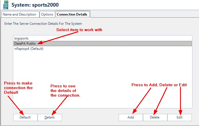 To set a Connection as the default connection, select it by clicking on it in the list view, then press the Default button.