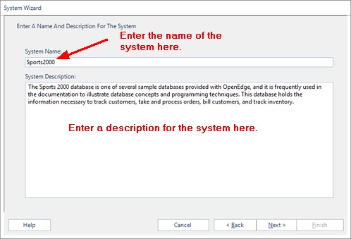 The System Wizard - Name And Description form (Pictured Below) allows you to enter the Name that you wish the system to be known by, and a free form description. You must enter a System Name, but the description is optional.