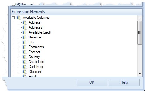 If the syntax of the expression you have entered is incorrect, the Calculated Columns Treeview and OK button will be disabled and the details of the syntax error will be displayed in the syntax message below the expression text box.
