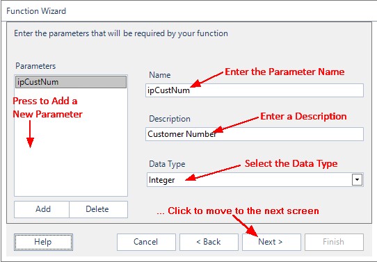 Enter the Name and Description for each Parameter, then select the required Data Type. |