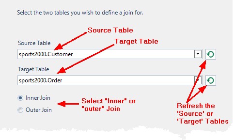 If the drop down boxes are not showing the tables you expect, or Newly added tables are not visible clicking on the Refresh buttons will